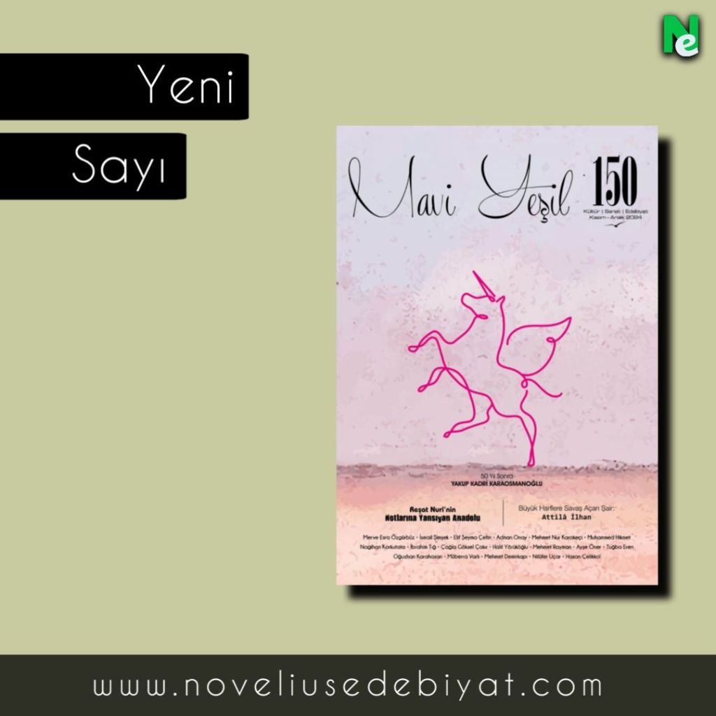 2000 yılının Ocak ayında edebiyat dünyasına ilk adımını atan Mavi Yeşil, Kasım-Aralık 2024 tarihli 150. sayısıyla 25. yılını tamamladı. İki aylık periyodik yayımının hiçbir sayısını aksatmadan küçük adımlarla da olsa yoluna devam eden Mavi Yeşil dergisi, yirmi beş yıllık bu zorlu yayım sürecini okur ve yazarlarının ilgisiyle tamamladı. Çeyrek asırlık bu yolculukta mütevazı Mavi Yeşil dergisiyle ilgilenen okur ve yazar dostlarımıza içtenlikle teşekkür ediyoruz. Böyle bir ortamda iyi ki edebiyat var, iyi ki edebiyatın atardamarı dergileri var… Halil Yörükoğlu, Ayşe Öner ve Oğuzhan Karahasan, bu sayımızın üç öykücüsü. Adnan Onay, Muhammet Hikmet, İbrahim Tığ, Mehmet Rayman, Tuğba Eren, Müberra Varlı, Mehmet Demirkapı, Nilüfer Uçar ve Hasan Çelikkol, bu sayımıza şiirleriyle katıldılar. Bu sayımızda, ölümünün ellinci yılı için Yakup Kadri Karaosmanoğlu hakkında mütevazı bir dosya hazırladık. Dosya yazılarını Merve Esra Özgürbüz, İsmail Şimşek ve Elif Şeyma Çetin yazdı. Dosya dışındaki yazılarıyla Mehmet Nur Karakeçi, Nagihan Korkutata ve Çağla Göksel Çakır, dergiye katkı sağladılar.
